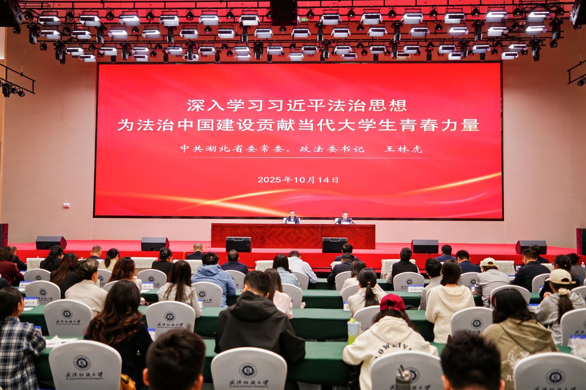 根据省委统一安排,10月14日,省委常委、政法委书记王林虎赴武汉纺织大学,以“深入学习习近平法治思想,为法治中国建设贡献当代大学生青春力量”为题,为师生讲授思政课,并调研学校科技创新工作。