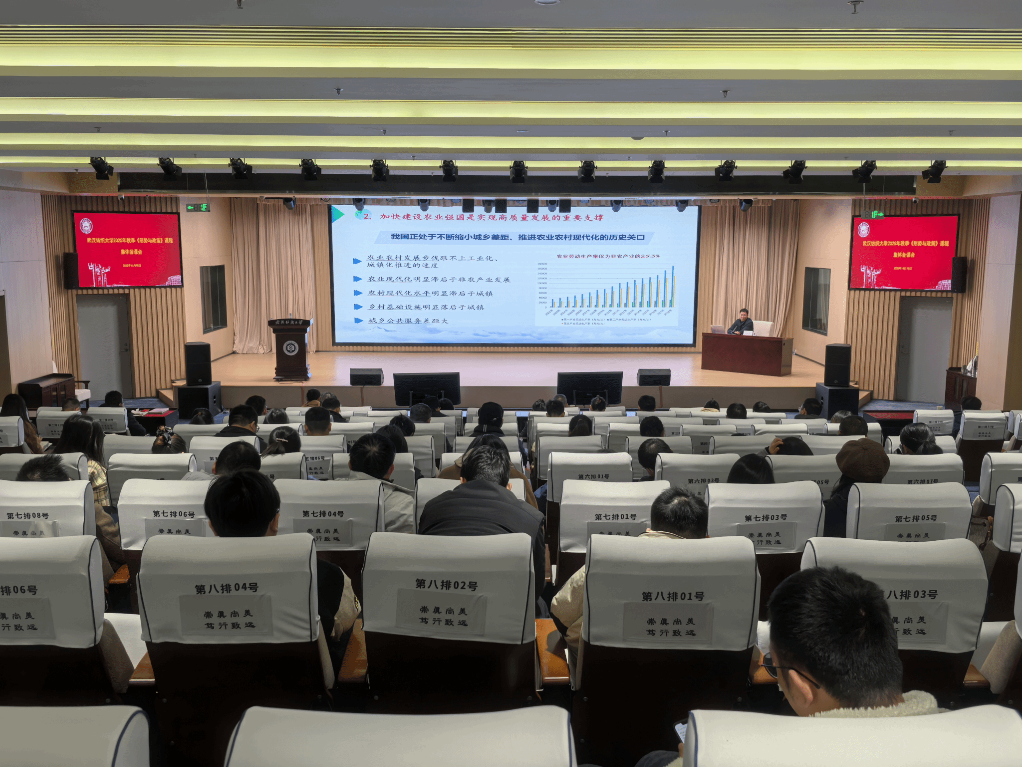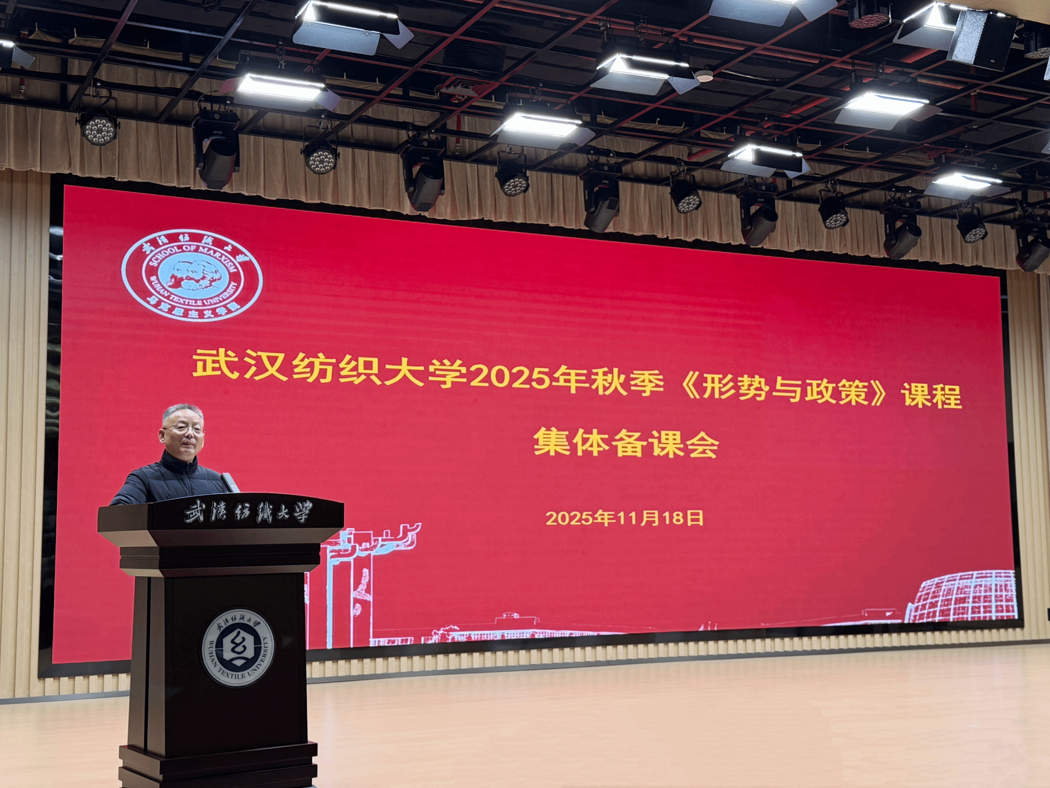 11月18日上午,武汉纺织大学2025年秋季学期《形势与政策》课集体备课会在阳光校区建全会堂稳健厅举行。校党委副书记、副校长罗锦银出席备课会并作专题讲话,华中农业大学马克思主义学院副院长、乡村振兴研究院副院长霍军亮教授作“农业强国”主题辅导报告,学校全体《形势与政策》任课教师参加会议,马克思主义学院党委书记邹茜主持备课会。